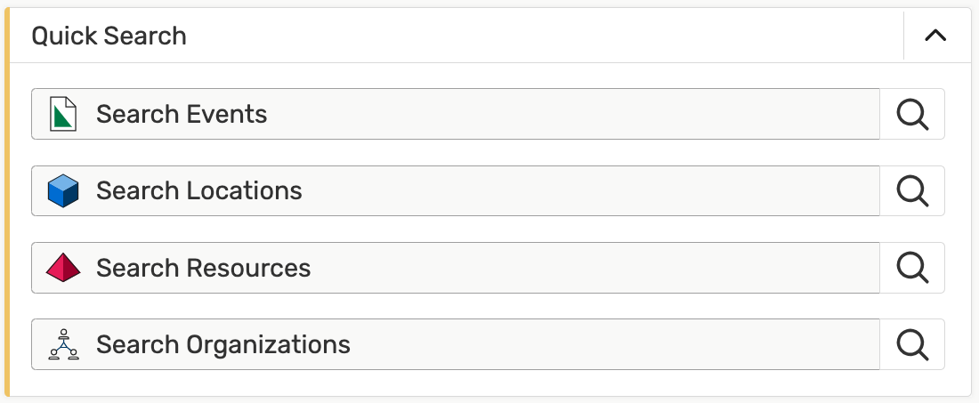 Type in one or more keywords for the type of object you want to search for, and use the search button(s) to continue. The Quick search looks through the names and titles of events, locations, organizations, and resources, as well as event reference numbers.
