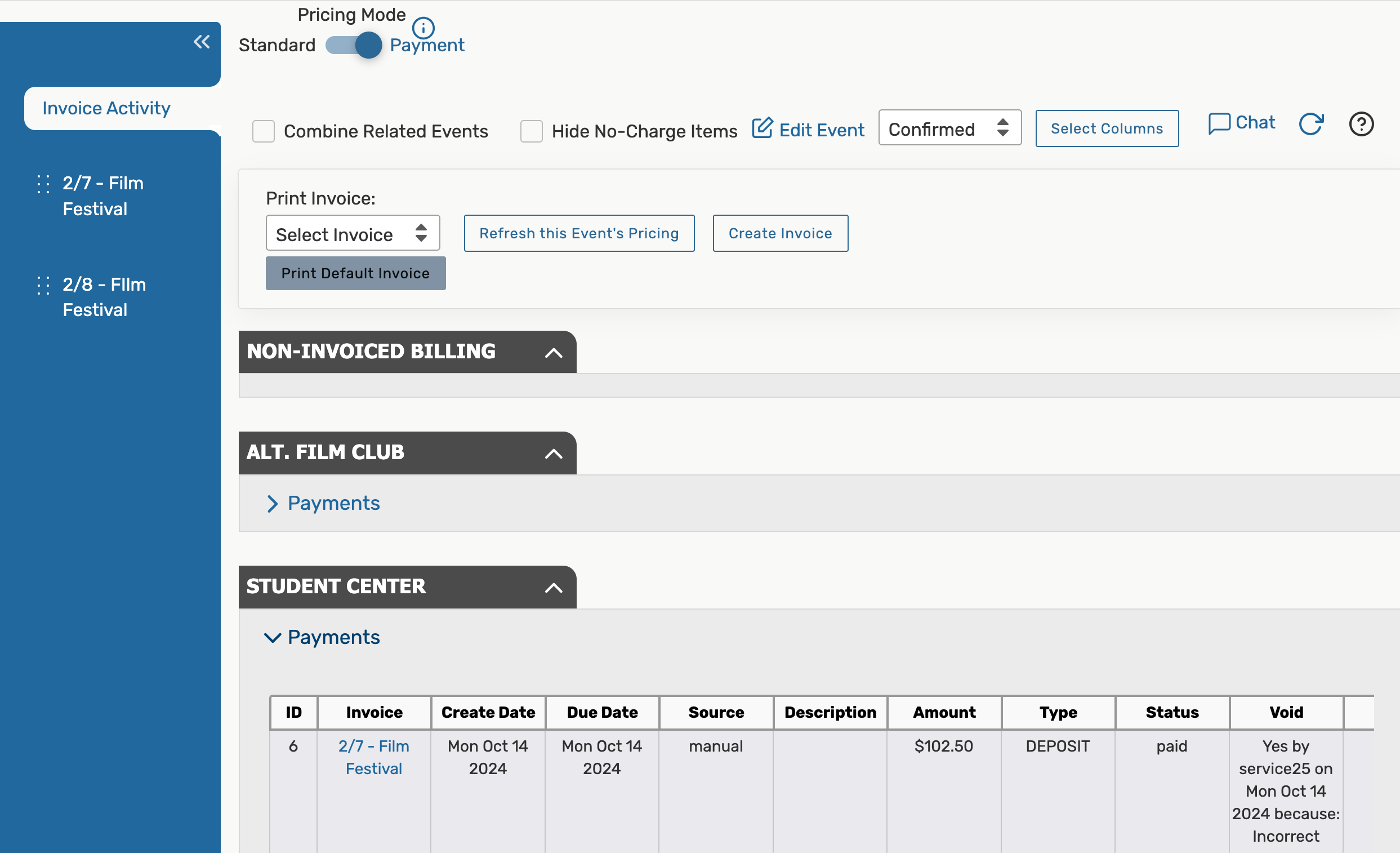 For more information, please see Viewing and Modifying Event Pricing, Generating an Invoice, & Managing Payments in 25Live.