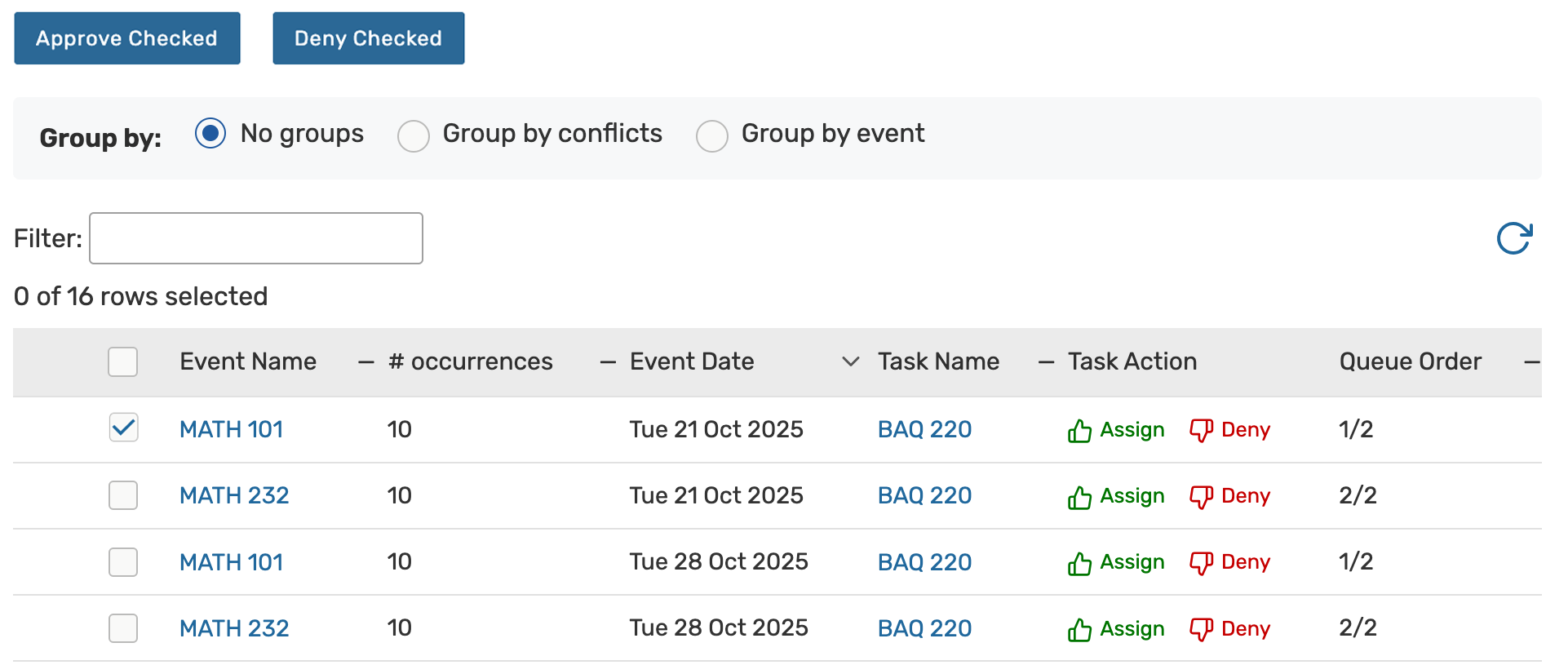 The Schedule view is a type of Availability (Daily) grid that is specific to events. You cannot create additional occurrences from the grid, but you can reschedule them. |